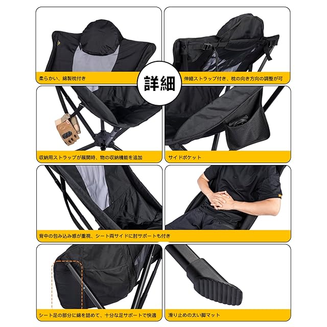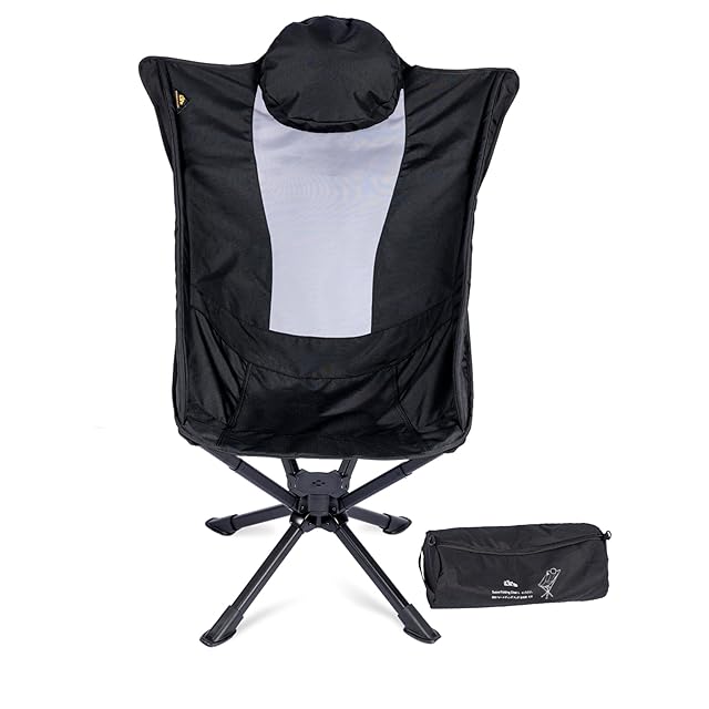 ★もっとリラックス、もっと楽しく、もっと自由に!キャンプハイバックチェア且つ柔らかい綿製枕付きに、枕向き方向も伸縮ストラップで調整可です。背中の包み込み感が重視、シート両サイドに肘サポート付き、シート足の部分に厚手の綿を詰めて、十分な足サポートで座る時、超快適、全身的リラックス、360度回転機能もあるアウトドア椅子です。これからキャンプの時、周りのものを取りたい、周りの人と話したい時、椅子から身の立上の必要がない、座ったまま振り返る必要もないです、特に向きを変える時、椅子が倒れる心配がなく、これからパノラマビューで360度の風景が見渡せ、もっと楽しく、もっと自由のアウトドア活動の実現ができます。