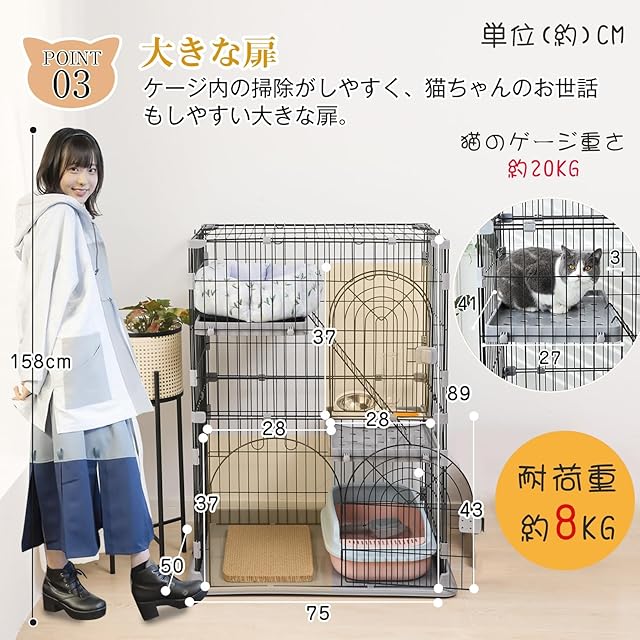 【猫 ゲージ2段 内容】ケージ本体X1、棚板X2、梯子X1、トレイX1(猫のトイレは含まれていません)トレー:ABS樹脂製、猫ケージ:頑丈なスチール、ケージ重さ:約20kg。猫用ケージサイズ:75x43x89cm、 棚板サイズ:約41*27CM 梯子サイズ:約52*13CM