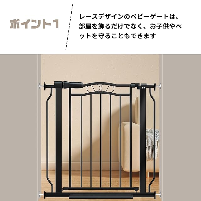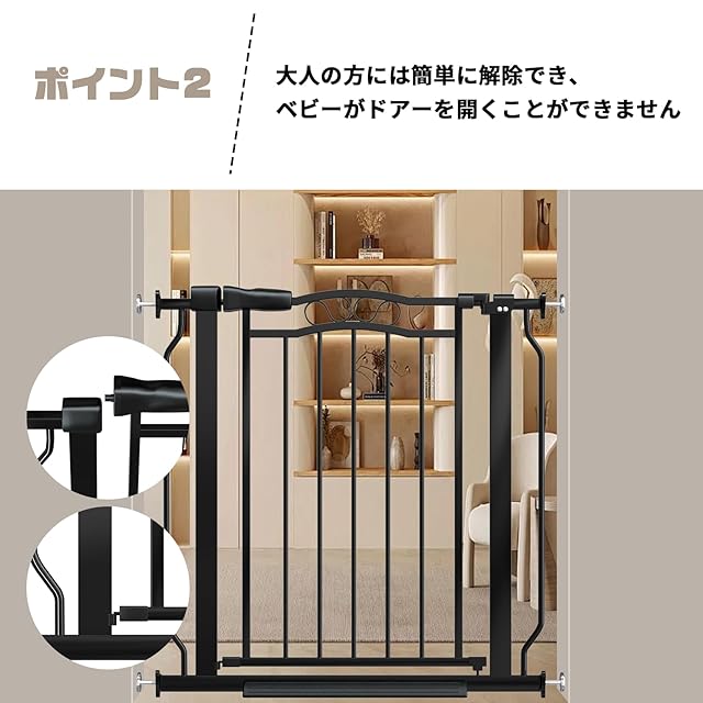 多様な設置場所:ベビーゲートは拡張フレームを使用することで、最大幅206cmまでの設置が可能です。このベビーゲートは、階段、ドアの入口、廊下など、さまざまな場所に柔軟に設置でき、特に階段の上部や出入口に設置することで、子供が危険なエリアに入るのを効果的に防ぎます。ベビーゲートはペットを飼っている家庭にも最適です。