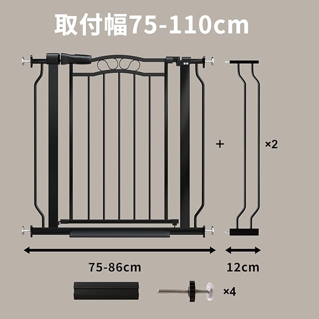 unumum ベビーゲート 設置幅75-110cm ブラック ペットゲート 犬 自動ロック バリアフリー ゲート 階段上 扉開閉式 赤ちゃん 突っ張り式 オートクローズ機能 拡張可能 壁 開閉式 保護 高さ78cm