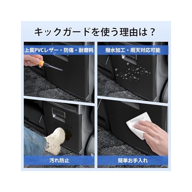 2.【キズや汚れからご愛車を守る】:車に乗っている時、ついてしまうキズや汚れからしっかり保護!完全車種別専用設計のキックガードで、ピッタリ装着で長期使用も安心。気づかないうちについてしまうキズや汚れをしっかりガードし、車内をクールで快適な空間に保ちます。いつもの車内を、より優れたスペースに変えるアイテムです。