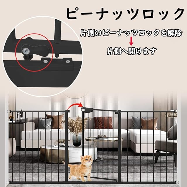 「三重ロック」通常のダブルロックからさらにアップ、ピーナッツロック方法を追加しました。開け方法:一番下のロックを開錠してから、押しながら持ち上げると開ける。ベビーゲートは大人にとってすごく簡単に開けるように作ったが、赤ちゃんにとって難しいロックです。