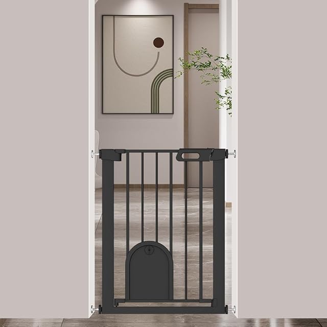 Fairy Baby ベビーゲート ペットドア付き 取付幅61-68CM 猫 犬 ゲート 高さ76cm ベビーフェンス 突っ張り式 ダブルロック 自動閉鎖 両開き扉 赤ちゃんゲート ベビーガード 玄関 階段 拡張フレーム付き ブラック