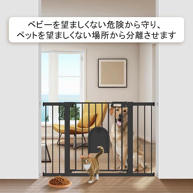 【ペットドア付き】ベビーゲートには猫と小型犬の出入りに便利な小さなドアが付いています。19*17.8cmのペットドアは小さなペットを通過させることができ、大きなペットを外に遮り。このベビーゲートの小さなペットドアが開く高さは調節して固定することができます。ロック機能を含む、ペットドア付き、ベビーゲートは赤ちゃんやペットがいる家庭に適しています。