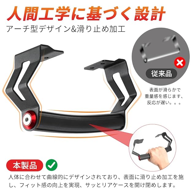 【高品質な材質】開閉アシストグリップの表面には凹凸状の溝が設計され、つや消し加工も施されていますので、 滑り止め効果をより一層高め、有機溶剤などが着いた手で触れる場合も車体が汚ず、滑ることもありません。オールブラックなので取り付けても違和感がありません。また、夏に直射日光で熱くなるのを考慮して、ステンレススチ一ル製ではなく放熱性の良いアルミニウム合金を採用され、夏時も楽になります。