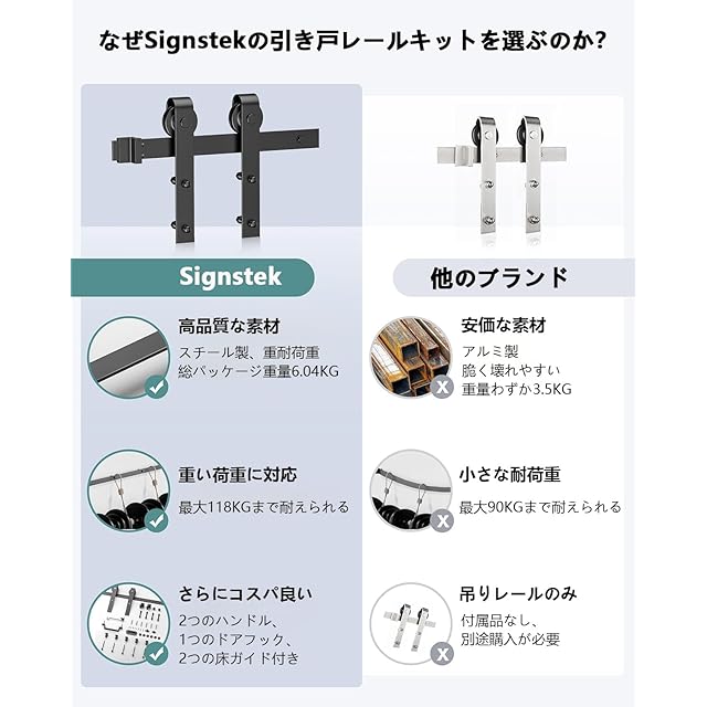 Signstek 吊り引き戸レール バーンドア金具 6FT/1.83m リフォーム建具 引戸レール 扉引戸 簡易 室内 木製 引き違い ドア 引き扉 DIY 建具金物 アルミレール シングル扉 トラックレール 片引き戸 J型 5段式 ブラック