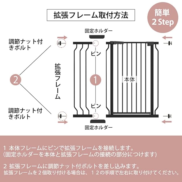 「穴開け不要のつっぱり式」簡単に設置できるつっぱり式ベビーゲート。壁に穴を開ける必要なく、アジャスターボルトで簡単に固定、壁にキッズなども残りません。