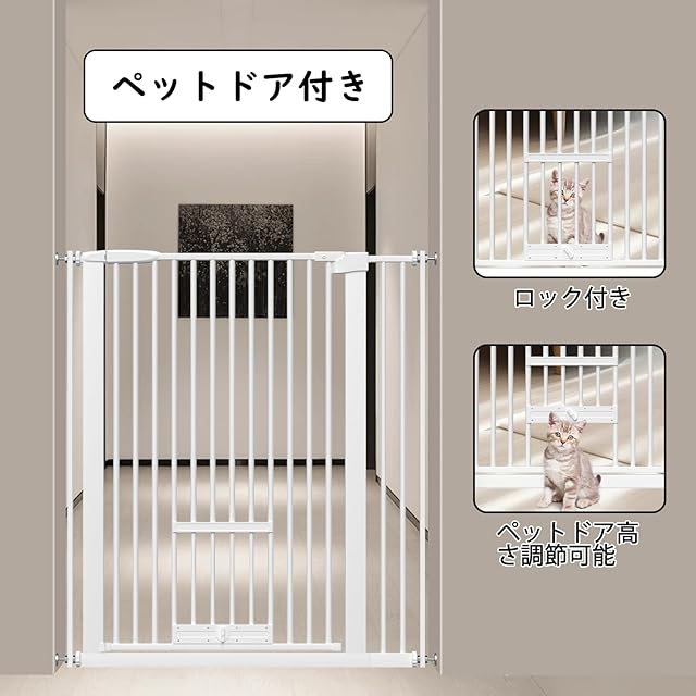 【ペットドア付き】このペットゲートには猫ドアが付いており、猫と小型犬が自由に出入りできます。ロック付き、ペットドアの高さは自由に調節可能、必要な時には完全にオフにすることもできます。