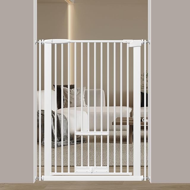 Seogva ペットゲート ベビーゲート 高さ103㎝ 間隔3 ㎝ ペットゲート ドア付き 猫すり抜け防止 飛び越え防止ゲート 猫ドア付きゲート 過密フレーム付き(ホワイト 62-71cm)