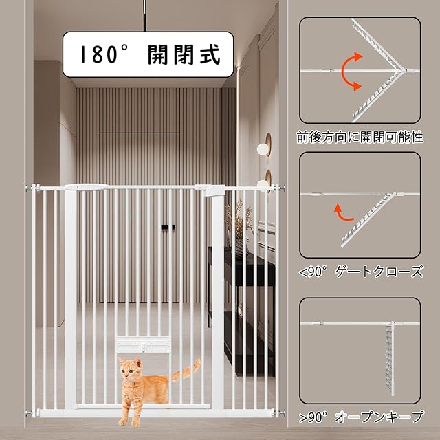 【180°開閉式タイプ】ドアロックはフロントとリアの両方からオン/オフの切り替えが可能で、開き角度<90°と、ゲートが自動的に閉まります。 開き角度>90°と、ゲートは開いた状態になります。このデザインは、ドアの閉め忘れを効果的に防ぐと同時に、人の出入りにとても便利です。