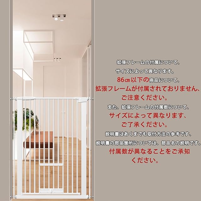 【拡張フレーム付き】拡張フレームの組み合わせによって、ベビーゲートの長さは最大216cmまで設置可能です。ご自宅の現場実寸を参考にご購入ください。過密フレーム付きのため、最大サイズに設置しても、左右側に隙間がない。隙間からすり抜け防止に大活躍です。また、サイズによって、付属されるフレームが異なります。引っ越し時に幅に合わせて、拡張フレームを追加することによって、再利用することが可能です。