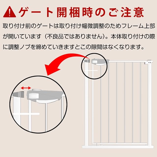 「突っ張りタイプ」穴け不要、簡単に設置できるつっぱり式ベビーゲート。壁に穴を開ける必要なく、アジャスターボルトで簡単に固定、壁にキッズなども残りません。