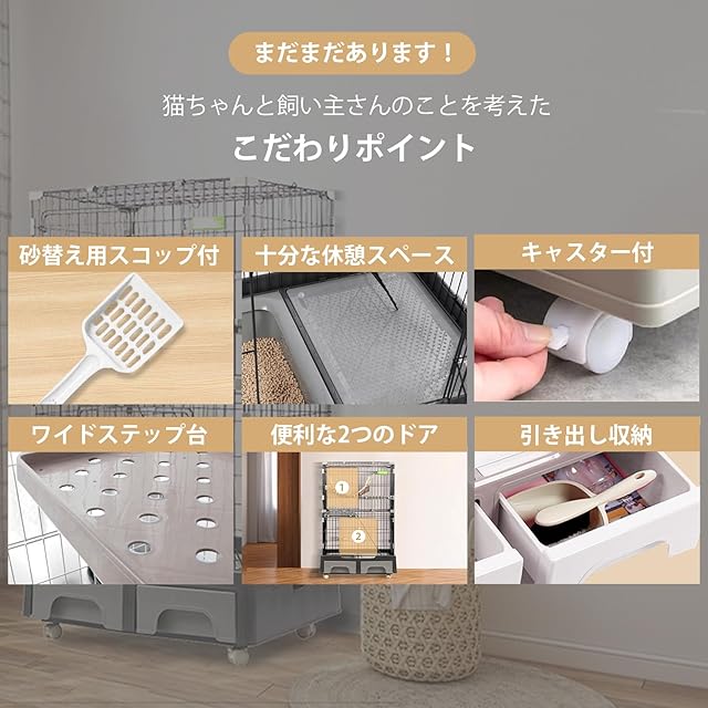 【多機能デザイン】この猫ケージは、猫用トイレ、引き出し、ハンモック、はしごを備えた多機能設計で、猫のさまざまなニーズを満たし、ペットが自宅で快適で安全な空間を楽しめるようになっています。