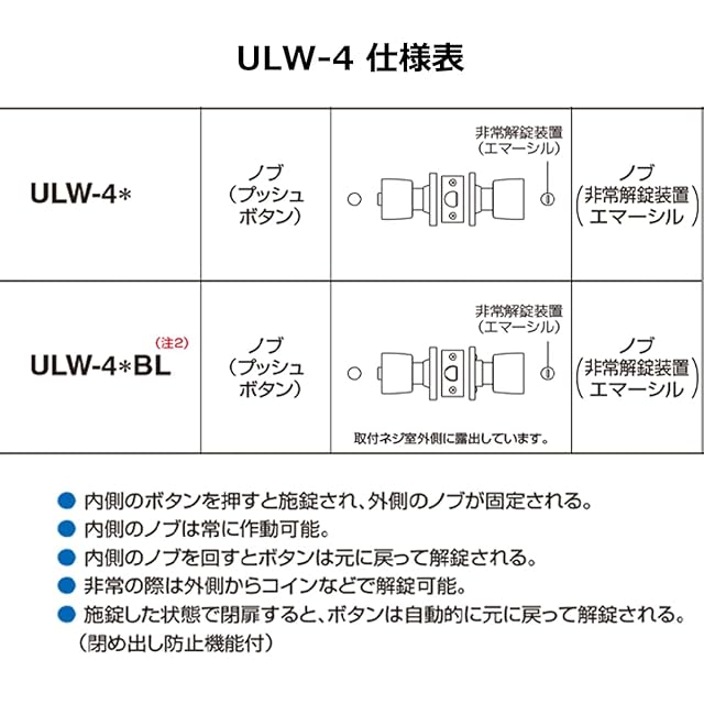 ロック機能付きで室内側からボタンを押すとロックされます。室外からもコインで開けられる非常解錠機能付きです。※キーの付属はありません