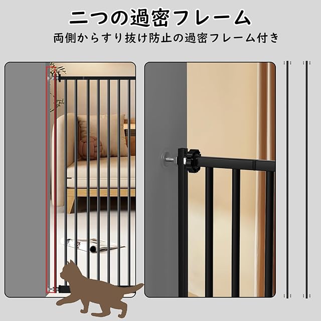 【赤ちゃんとペット脱出防止・すり抜け防止】高さが100cm以上のハイゲートので、赤ちゃんや猫、犬がベビーゲートから逃げるのは簡単ではない。通常タイプと違って柵間の隙間は3.5cmです、子猫のすり抜け防止ゲートです。高さ103cm、幅は76cmから216cmまであります。お子様やペットの安全を守ることができるハイゲートです。ベビーゲートは、玄関、キッチン、部屋、階段上、ランドリーなど、家の中のさまざまな場所に適しています。