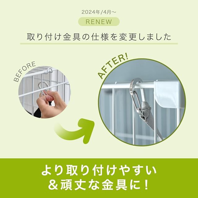 ※破損の原因になりますので、ケージの上に物を置かないでください。 ※曲線部や若干の個体差、組立などにより表記と多少の差異が生じる場合がございます。予めご了承ください。 ※2021年7月12日より、プラスチック部分(ステップ・土台)の仕様を変更しました。 ※2024年4月、にゃんもっく取り付け金具の仕様を変更しました。