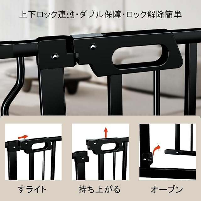 【ダブルロック】ペットゲートに上下のロックが連動して、ダブル保障になります。片手でボタンをスライドさせて同時に引き上げでロックが解除できます。ゲートは大人にとってすごく簡単に開けるように作ったが、赤ちゃんやペットにとって難しいロックです。