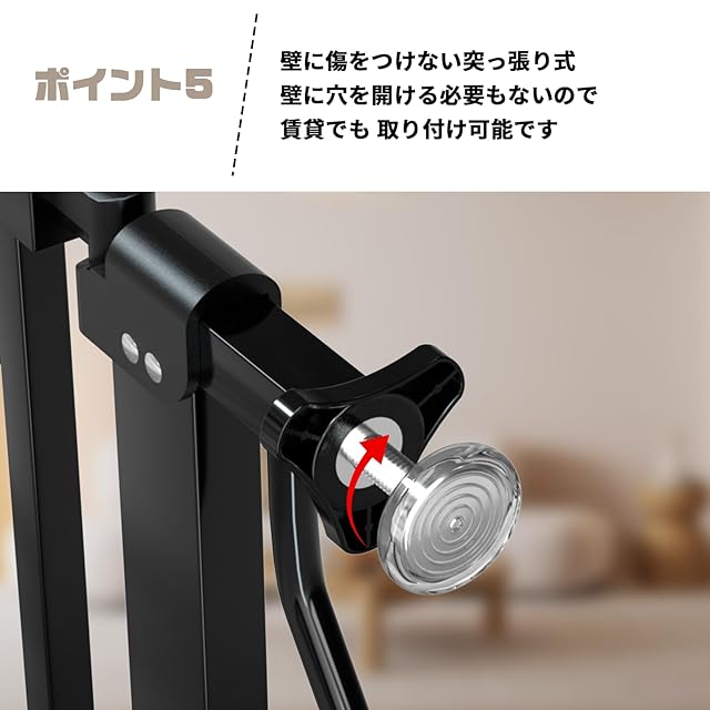 簡単な組み立てと突っ張り式:ベビーゲートは突っ張り式の取り付け方式を採用しており、壁に穴を開ける必要がなく、取り外しも簡単で、壁を傷つけません。ベビーゲートはさまざまな幅のドア枠や階段通路に対応できる拡張機能もあります。ベビーゲートは壁に穴を開ける必要がないため、賃貸住宅でも取り付け可能です。一人でも簡単に設置でき、複雑な工具は不要で、ネジを回すだけで取り付けが可能です。ベビーゲートは説明書に従って設置すれば、約15分で完了します。さらに、危険な場所に設置する際には、ネジで壁に固定することで、より安全性を高めることができます。