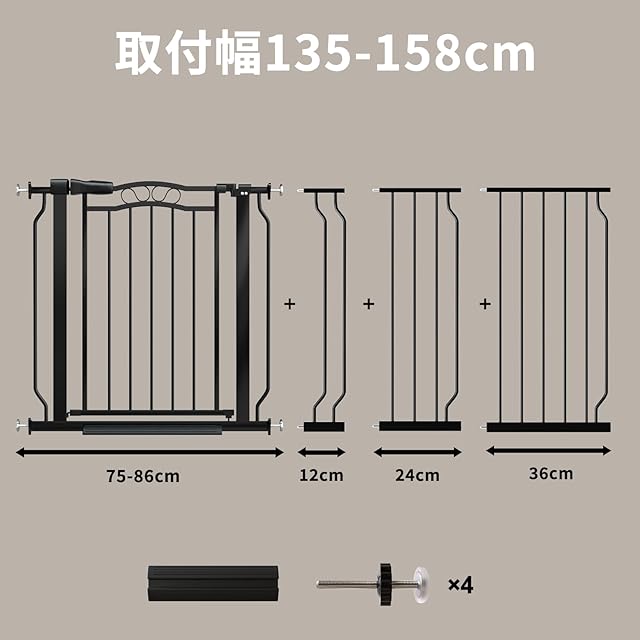 unumum ベビーゲート 設置幅135-158cm ブラック ペットゲート 犬 自動ロック バリアフリー ゲート 階段上 扉開閉式 赤ちゃん 突っ張り式 オートクローズ機能 拡張可能 壁 開閉式 保護 高さ78cm