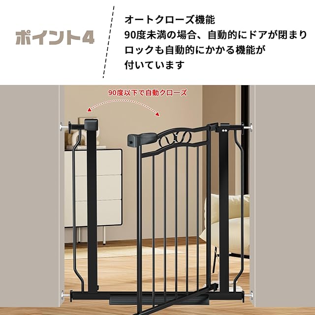 オートクローズ機能&前後両開き:ベビーゲートはドアを90度以上開けると、その状態を維持します。ベビーゲートは90度未満で開けた場合、手を離すと自動的にドアが閉まり、ロックも自動的にかかります。ベビーゲートのこの機能により、使用状況に応じて自由に使え、通行時のストレスを軽減します。ベビーゲートは180度開閉式ゲートで、出入りがスムーズで、ゲートを閉め忘れることを防ぎ、子供やペットの安全を守ります。