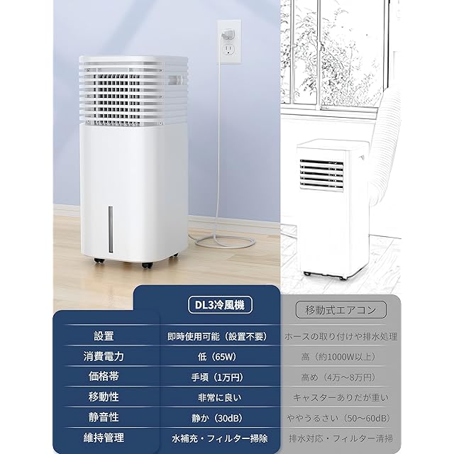 【DL3冷風機が移動式エアコンに完勝!冷風機 強力 人気】DL3冷風機は、設置不要で手軽に使える冷却家電として、特に省エネ志向の方や簡単な涼しさを求めているユーザーにおすすめの製品です。従来の移動式エアコンのように窓へのホース取り付けや排水処理が一切不要なため、引っ越し先やオフィスなど、場所を選ばずどこでもすぐに使用を開始できます。また、消費電力はわずか65Wと非常に低く、長時間使っても電気代を気にすることなく経済的です。さらに、運転音は30dBと静かで、寝室や書斎などでの使用にも最適。夜間でも邪魔になることなく快適な睡眠や作業が可能です。維持管理も簡単で、定期的な水の補充とフィルターの掃除だけで清潔さを保てます。価格帯も1万円前後と移動式エアコンに比べて圧倒的にリーズナブルで、コストパフォーマンスに優れています。真夏の暑さ対策として、シンプルでスマートな選択肢をお探しの方にはぜひおすすめしたい一台です。