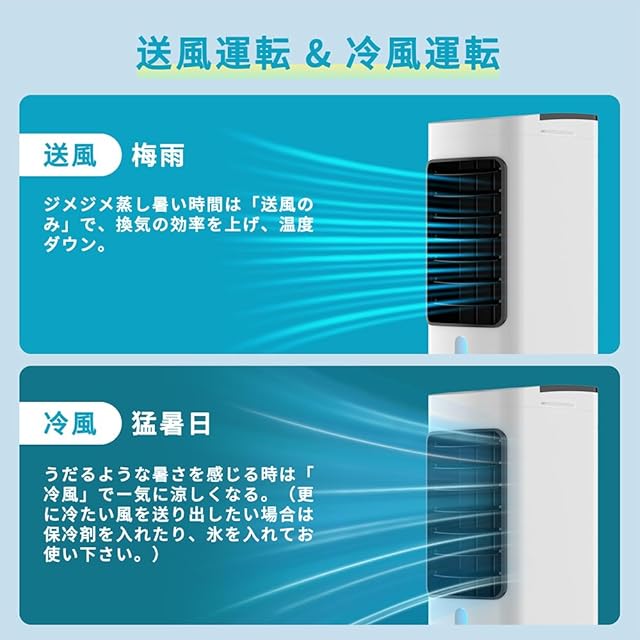 【左右自動60°・上下120°風向調節&省エネ】 冷風機 は上下ルーバーを手動約120°まで風向調節可能、更に左右ルーバーも付いており、スイッチを入れると風を自動的に左右60°に振ってくれて、より広範囲に冷却できて、暑い季節に涼しさはすばやく部屋に充満させ、あなたに爽やかで包み込まれて、気持ちよい室内環境を作ります。最大消費電力はただ70w、周波数:50/60Hz;一夜中運転しても、安くて、財布に優しいです。